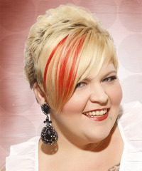 This funky 'do is cut short around the sides and back with textured layers at the crown for easy styling making this look best suited for those with round face shapes. The bags are have a splash of color added and blow-waved smooth for contrast. This look is perfect for those with naturally straight hair.